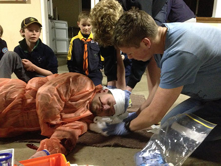 1st aid is an essential skill that is taught to all sections of the Scouting movement, even to Joeys (6-8 years old) who are taught the basics like how to apply Bandaids. Mark from Paramedical Training Services, ran the evening with help from a "simulated" patient (Rod), who was covered in fake blood courtesy of a few popular ingredients that can be found in everyones fridge. Add to that some fake bones, glass fragments sticking out and some "simulated raw flesh" for realism. Then just to spice it up a bit more, there was a half hidden rubber snake and a Medical alert bracelet warning that this pretend patient had diabetes. It really set the scene for the evening. Mark patiently worked with all the bystanders, ensuring that all issues were prioritised and treated appropriately. An excellent and educational night for all, and I am glad to say that Rod survived, in fact he was able to walk away with only a few sauce stains to show for his efforts.