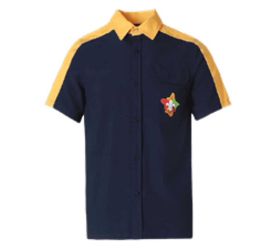 The Cub Scout Uniform consists of the dark blue shirt with the section colour, which is Yellow, across the sleeve, yoke and collar.