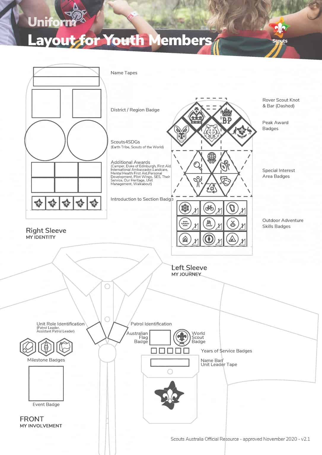 The Scout Uniform consists of the dark blue shirt with the section colour, which is Green, across the sleeve, yoke and collar.