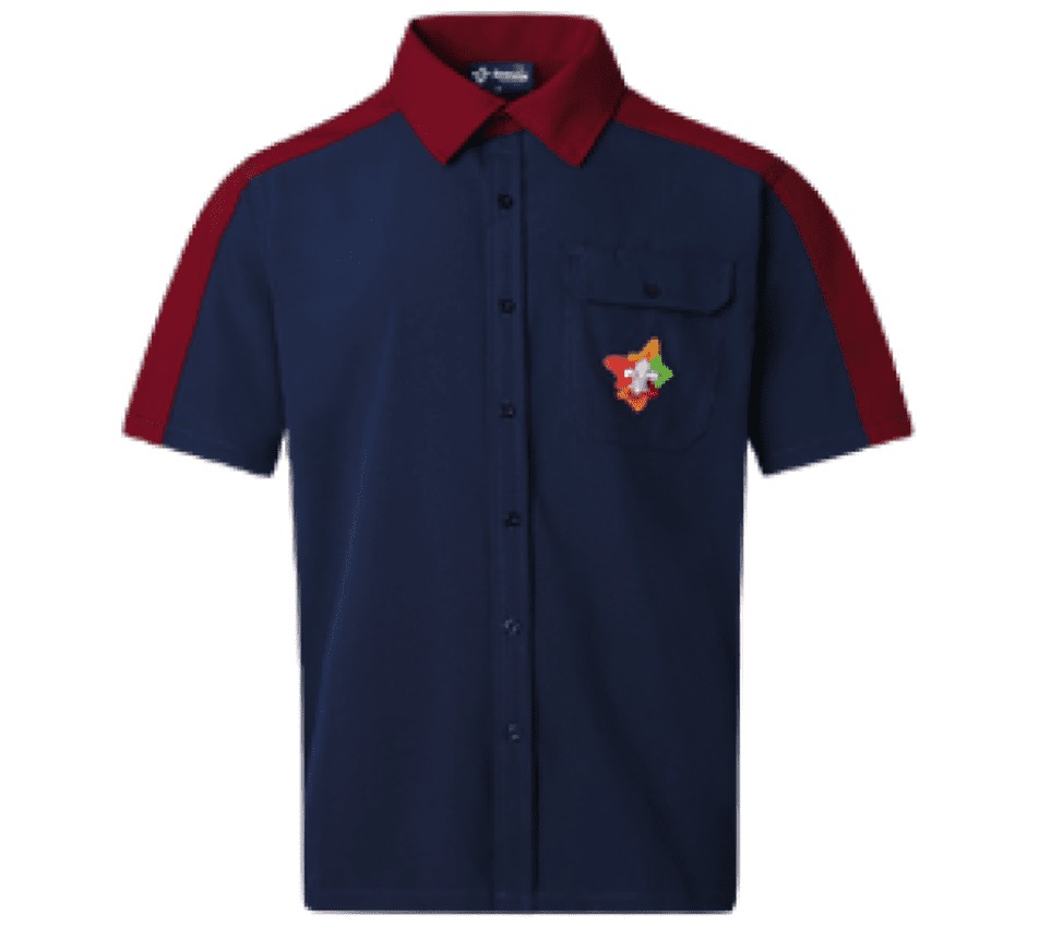 The Venturer Uniform consists of the dark blue shirt with the section colour, which is Maroon, across the sleeve, yoke and collar.